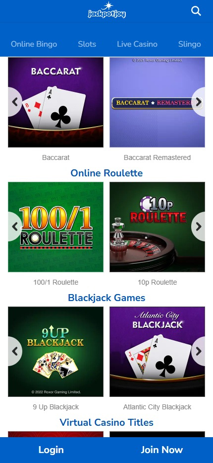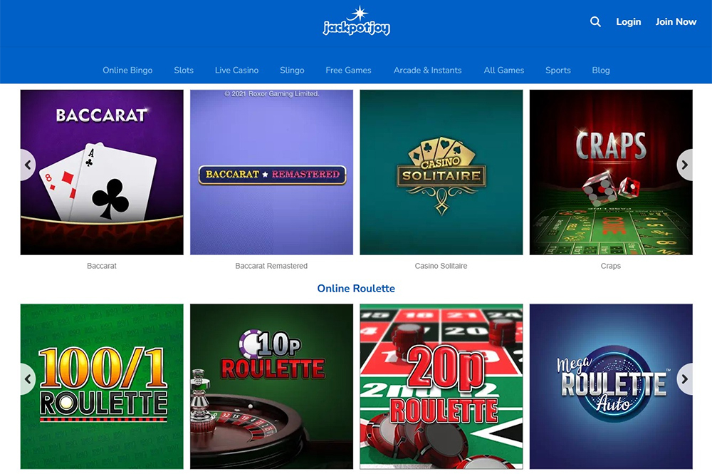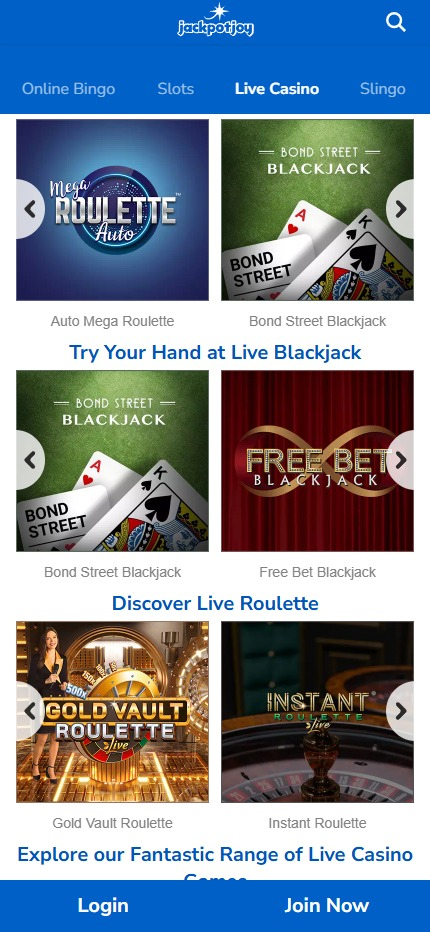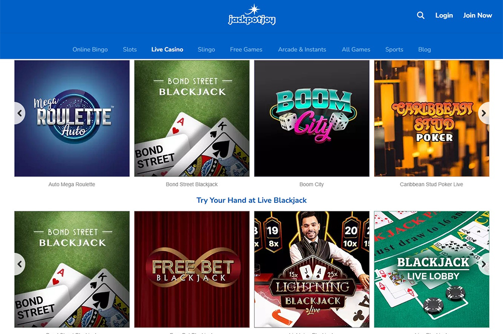 Jackpotjoy Casino offers live roulette, blackjack, baccarat, Casino Hold'em, Three-Card Poker, and Hi-Lo.