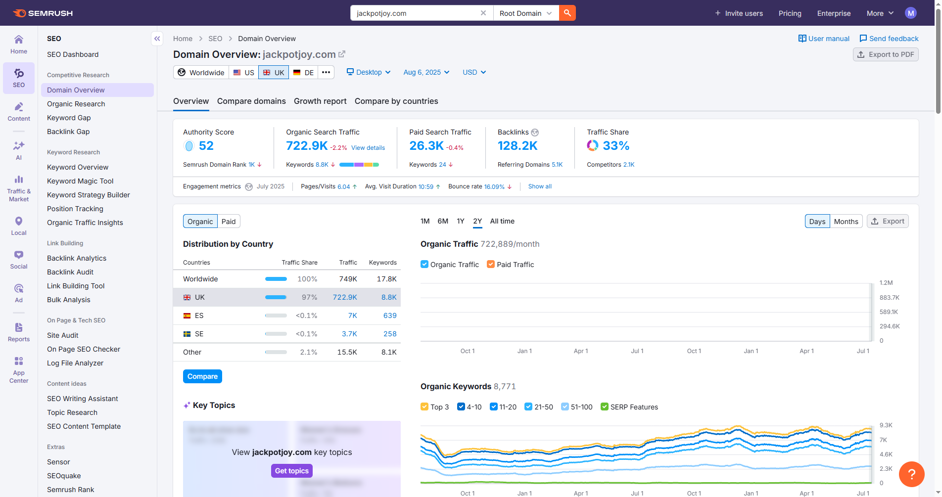 Below is a traffic estimate for Jackpotjoy based on data from Ahrefs and Semrush.
