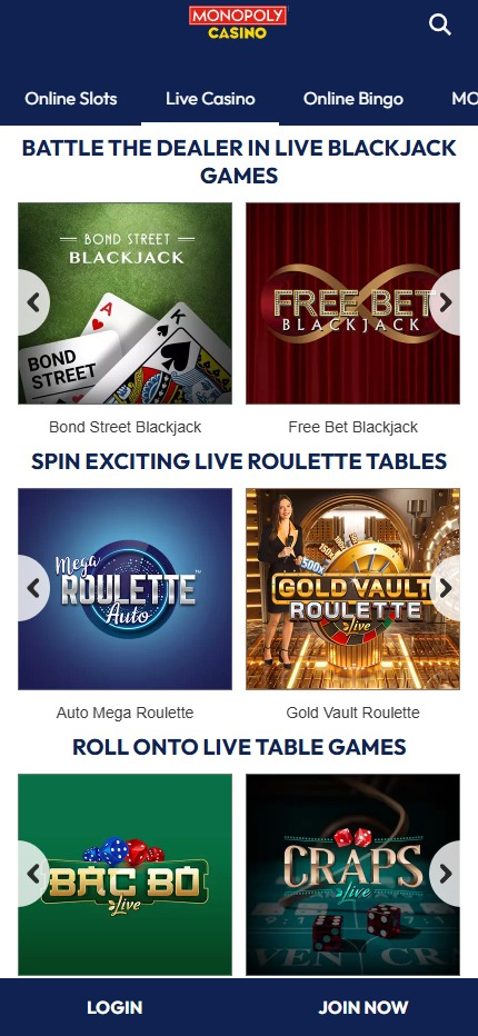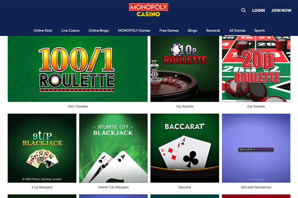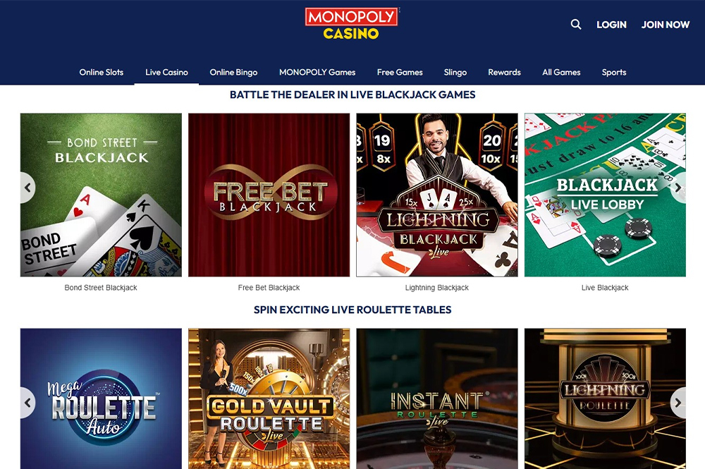 Monopoly Casino offers live roulette, blackjack, baccarat, Casino Hold'em, Three-Card Poker, and Hi-Lo.