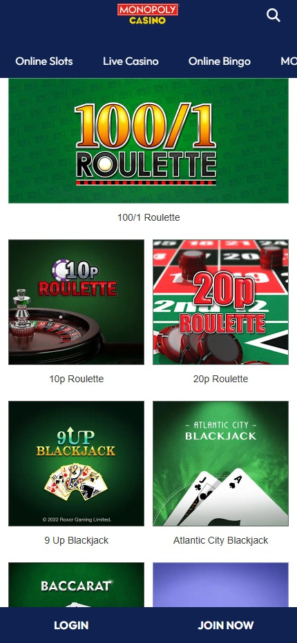 Monopoly Casino offers a good range of variations when it comes to both RNG and live dealer games. Popular titles like 10p Roulette, 100/1 Roulette, Atlantic City Blackjack, 9 Up Blackjack, or Baccarat can be easily found in the game library. The live casino lobby is also well-equipped with over 15 live roulette and more than 12 live blackjack tables.