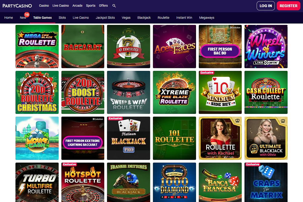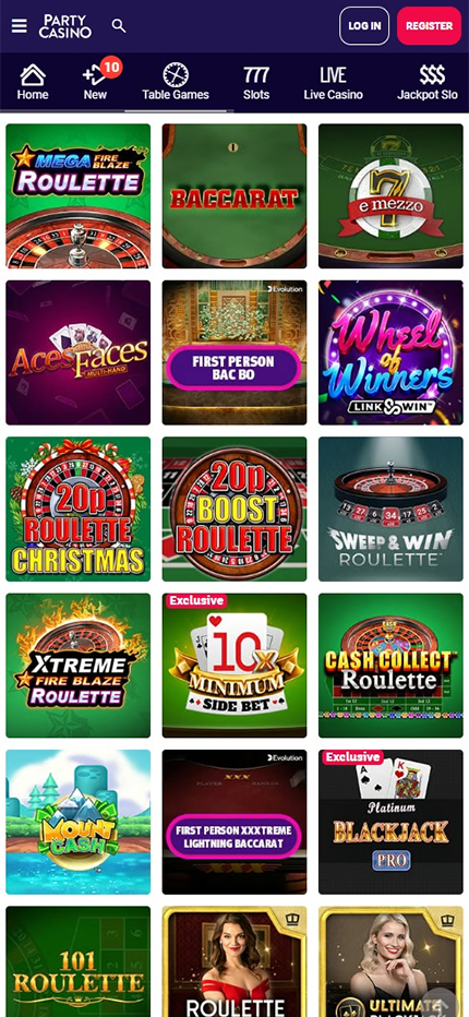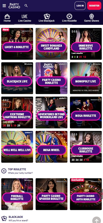 PartyCasino offers live roulette, blackjack, baccarat, Casino Hold'em, Three-Card Poker, and Hi-Lo.