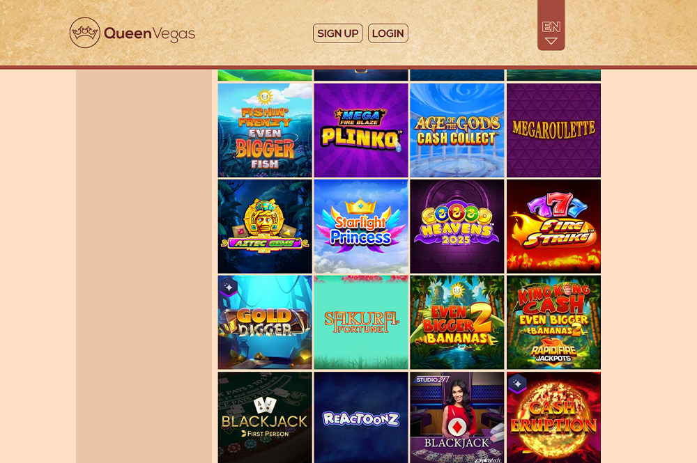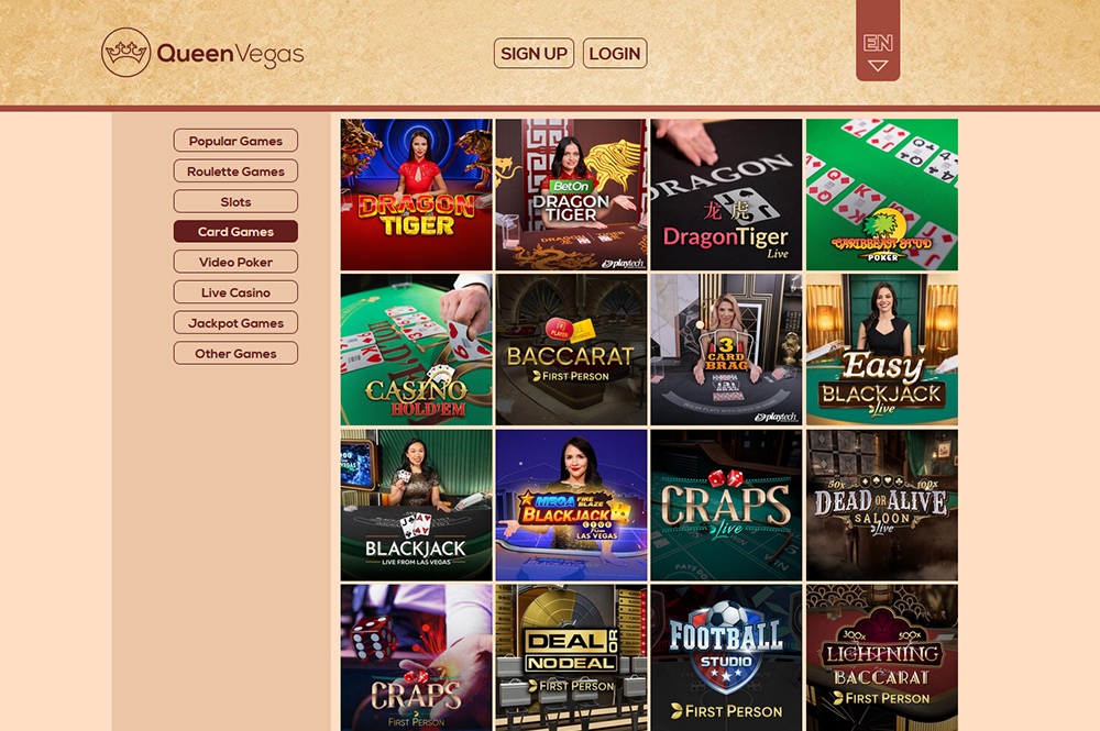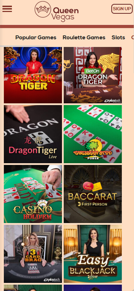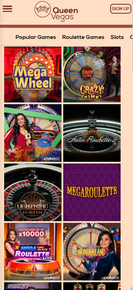 It is quite challenging to find the exact game at Queen Vegas. This is because there is no search menu, and players can not even filter by category or software provider. You can only select from roulette and live casino games from the sidebar tabs. This is too inconvenient, as there are also blackjack and poker games, but they lack separate tabs. This means that you have to scroll through the whole list to spot a title you may like.