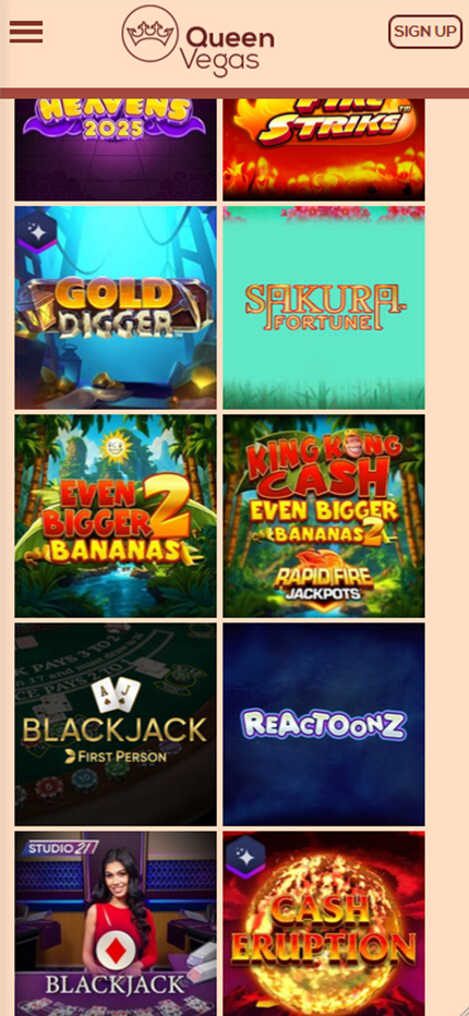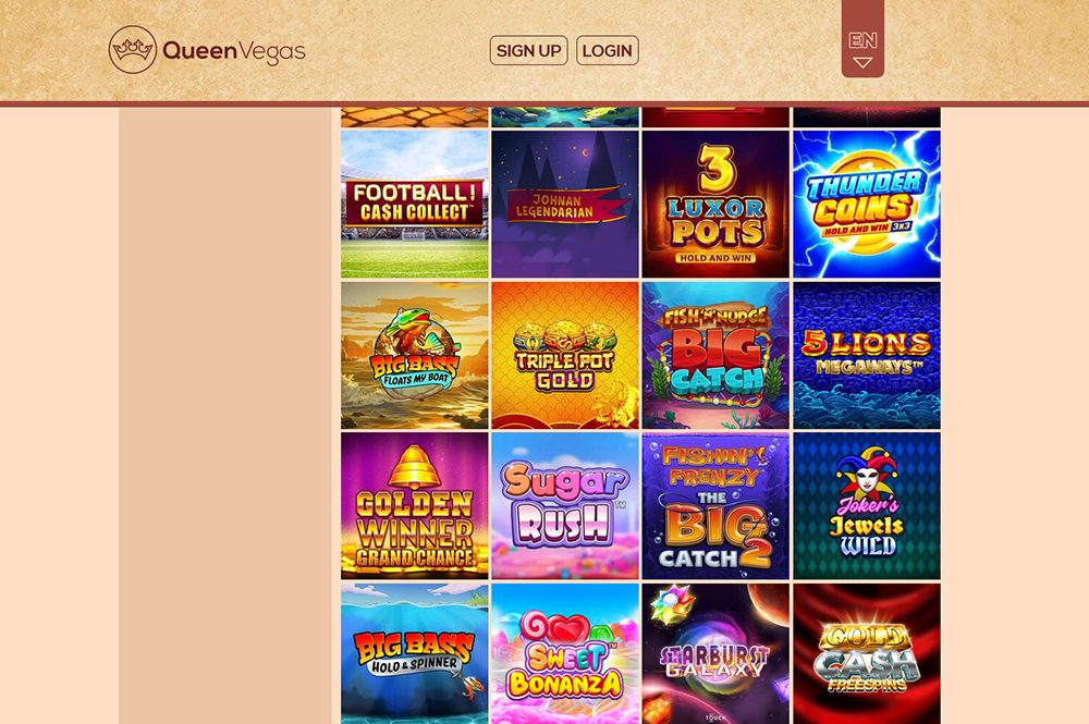 On the site, slots are just in one category with the same namesake. Queen Vegas should consider adding subcategories like at Grosvenor like new, hot, exclusive, festive favourites, etc. Alternatively, add themes or slots with high RTPs.