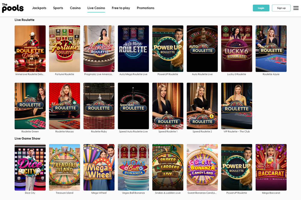 The Pools impressed me with its well-managed live casino lobby. Although not the biggest in the class, it offers an excellent mix of variations with attractive betting limits ranging between £0.10 and £5000. Some of the most popular titles include Auto Mega Roulette featuring multipliers of x100, x200, x500, or Azure Blackjack X, and Prive Launge Blackjack.